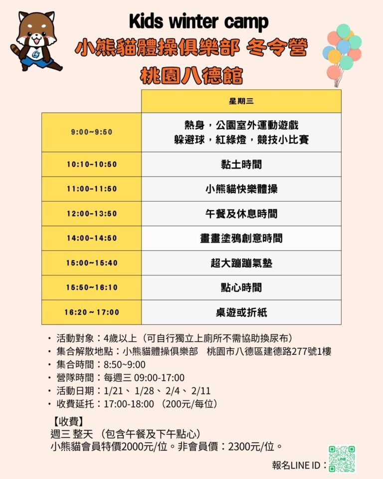 來自日本NO.1 兒童器械體操俱樂部 在日本已有幾十年的兒童體操經驗,結合台灣的文化習俗,重視兒童身心發展特點的教學。兒童體操運動不僅是強身健體的活動,更是培養人格、促進全面發展的重要途徑。 了解詳情 About Us 滿分的元氣 滿分的健康活力 【體操被譽為運動之母】,是所有運動的基礎。來自日本先進體操教育系統,優秀教練用心教導,我們根據不同年齡不同需求設計適合的體操體能課程,培養孩子體能協調和自信心。讓每個孩子找到屬於自己的運動天賦,綻放最燦爛的笑容! 預約體驗課 Our Courses 適合各年齡層的課程設計 從幼兒啟蒙班到進階技巧訓練,精心設計專屬的學習內容和體操課程。讓家長放心,孩子健康開心,在最適合的環境中培養運動興趣。 Level1 親子啟蒙班 1.5歲-3歲以下 透過親子互動,循環式闖關與遊戲,在開心的同時啟發孩子的身體潛能與專注力等能力。 Level2 幼幼入門班 3歲-4.5歲 透過專業引導與多元教具,讓孩子在安全快樂的環境中建立身體協調性,增進大身肌肉發展,自信心與社交能力。 Level3 幼兒體操班 4.6歲-6歲以下 使用各種體操器材進行基礎體操技巧訓練。讓孩子建立良好的身體協調性。培養從小喜愛運動的習慣。 Level4 兒童體操班 6歲以上 提升孩子的柔軟度,發展核心肌群與協調性。注重動作技巧與正確姿勢,集合遊戲與挑戰提升自信。 Level5,6 進階體操班 根據學員程度 挑戰更高階的體操動作,精進技巧與體能。邁入更專業的訓練。強化核心力量,爆發力,柔軟度,耐力等。 其他班: 特殊生班,1對1班(1對2, 1對3)空翻班(高階技術動作)等。歡迎諮詢報名! 立即連絡 Location 分館據點 各種諮詢體驗報名,請立即與各館聯絡。 台北市分館 新北市分館 桃園市分館 桃園市分館 台北市分館 新北市分館 桃園市分館 點選上方區域按鈕查閱分館資訊 台北市分館 公館分館 電話:(02)2364-9189地址:台北市大安區辛亥路1段38號1樓LINE ID:@298jdwpp 查看地圖 了解詳情 木柵分館 電話:(02)2936-0073地址:台北市大安區辛亥路1段38號LINE ID:@083emuec 查看地圖 了解詳情 內湖分館 電話:(02)2630-8915地址:台北市內湖區民權東路6段328號1樓LINE ID:@305pbpgd 查看地圖 了解詳情 松山分館 電話:(02)3762-1505地址:台北市松山區八德路四段135號B1LINE ID:@537nahkr 查看地圖 了解詳情 桃園市分館 桃園八德分館 地址:桃園市八德區建德路277號1樓LINE ID:@482gnvro 查看地圖 了解詳情 Latest News 最新消息 最新優惠, 通知 小虎世界 公館 內湖 木柵 4月好康 體驗【1+1】 以上優惠二選一,不能重複。 優惠期限:115.4.1-4.30 報名請洽各店官方li […] 其他 一次獲得核心・專注力・平衡感!體操教室有彈跳床的魅力 「最近的孩子活動量變少了」— 越來越常聽到這樣的聲音。 在每天忙於遊戲、課業與各種才藝課的生活中,我們該如何為 […] 過期活動 小熊貓體操桃園館 冬令營 擔心寒假孩子的精力旺盛無處發散嗎 冷冷的天更要動起來 我們策劃了各種有趣的活動, 讓孩子的寒假可以過得快樂又充 […] 更多文章
