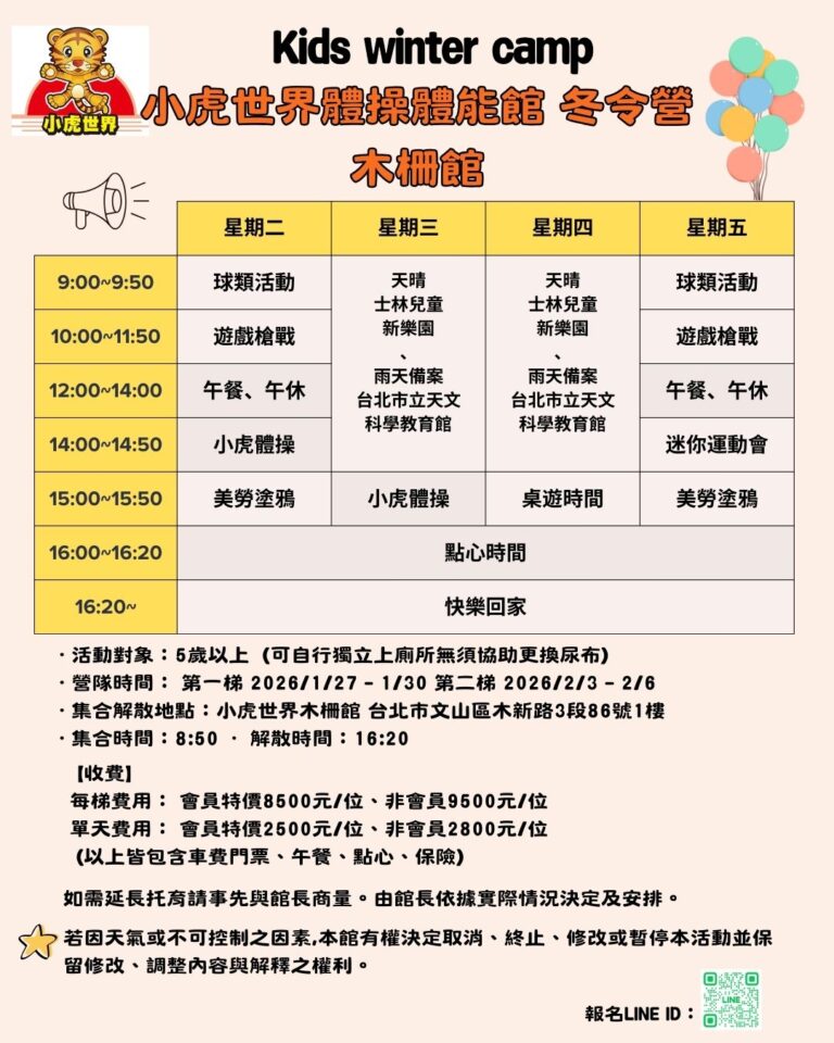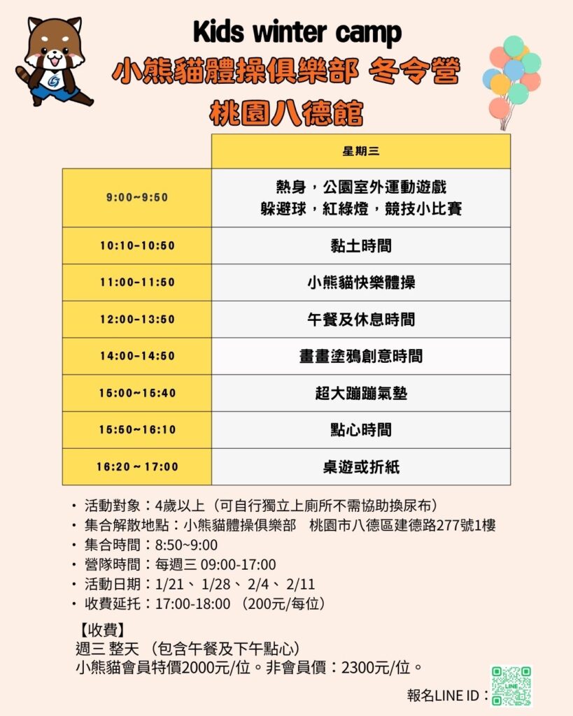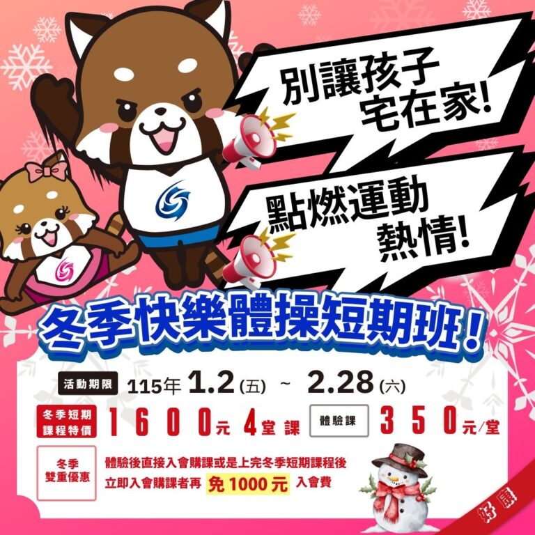 小熊貓體操桃園館 冬令營2026 / 1 月 / 22過期活動 擔心寒假孩子的精力旺盛無處發散嗎 冷冷的天更要動起來 我們策劃了各種有趣的活動, 讓孩子的寒假可以過得快樂又充實快來找教練過一個不一樣的寒假吧
